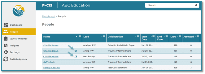 4. Assigned staff will see their own records and the shared records of the same people from other agencies, identified by a sharing symbol.